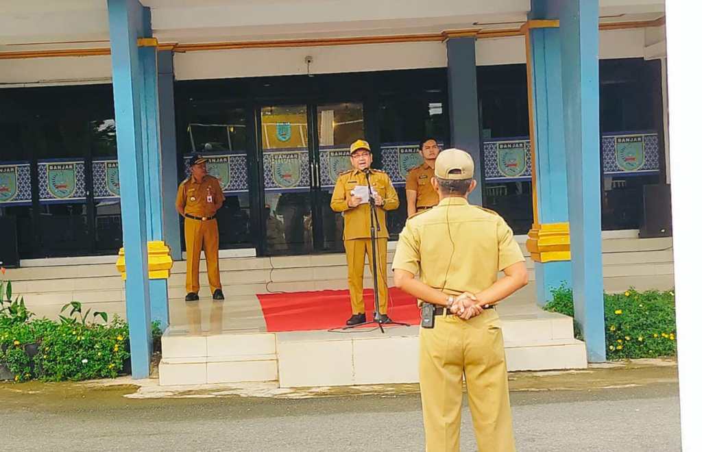 MARTAPURA – Apel Hari Kesadaran Nasional lingkup Pemerintah Kabupaten Banjar digelar dengan petugas dari Badan Penanggulangan Bencana Daerah (BPBD), di halaman Kantor Bupati Banjar, Martapura, Senin (20/1/2025) pagi.