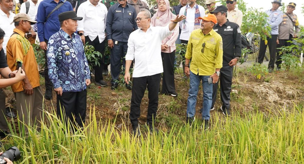 Batola—Menteri Koordinator (Menko) Bidang Pangan, Zulkifli Hasan (Zulhas) didampingi Gubernur Kalsel, H. Muhidin meninjau sawah bersama para petani di Desa Danda Jaya, Kecamatan Rantau Badauh, Kabupaten Barito Kuala (Batola), pada Sabtu (8/2/2025) sore.