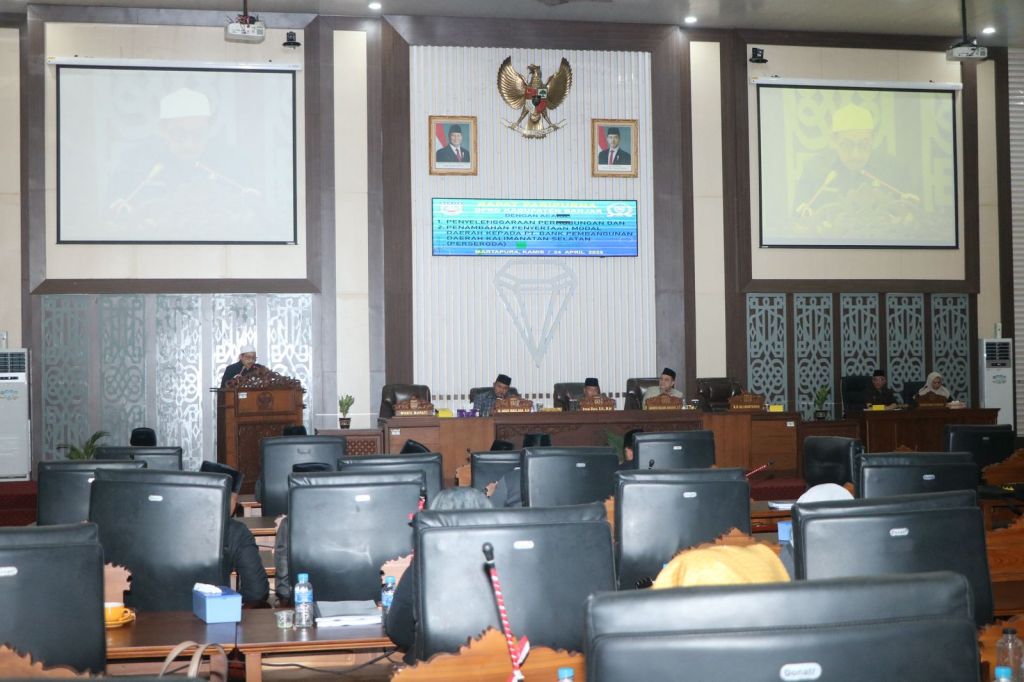 Rapat paripurna dengan agenda Penyampaian Bupati atas Raperda tentang Penyelenggaraan Perhubungan dan Penambahan Penyertaan Modal Daerah kepada PT Bank Pembangunan Daerah Kalsel (Perseroda).
