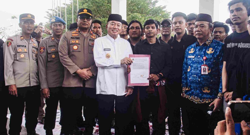 Banjarbaru—Menyerap aspirasi mahasiswa terkait pendidikan di Banua, Gubernur Kalsel H. Muhidin menyambut hangat dan mempersilahkan jika ada keluhan atau masukan dari mahasiswa maupun masyarakat saat aksi demonya di Kantor Gubernur Kalsel, Kota Banjarbaru pada Jum’at (2/5/2025) sore.