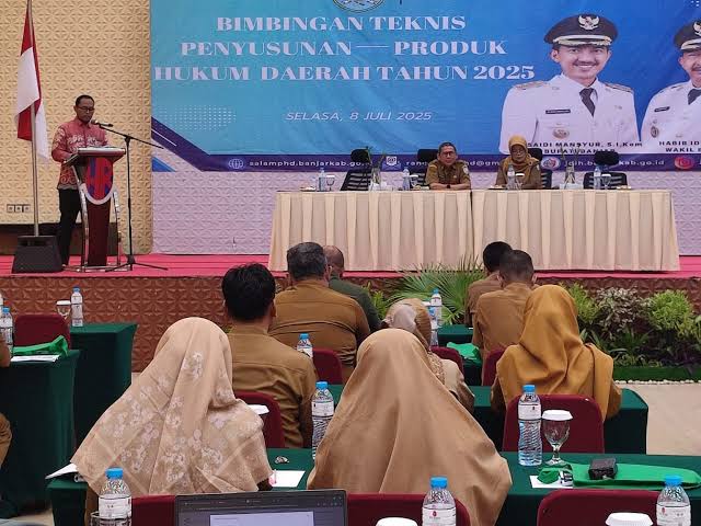 BANJARBARU – Pemerintah Kabupaten Banjar menggelar Bimbingan Teknis (Bimtek) Penyusunan Produk Hukum Daerah tahun 2025, Selasa (8/7/2025), di Hotel Roditha Banjarbaru. Kegiatan ini bertujuan untuk meningkatkan pemahaman pejabat PNS di lingkup Pemkab Banjar terkait tata cara dan substansi dalam penyusunan peraturan kepala daerah.