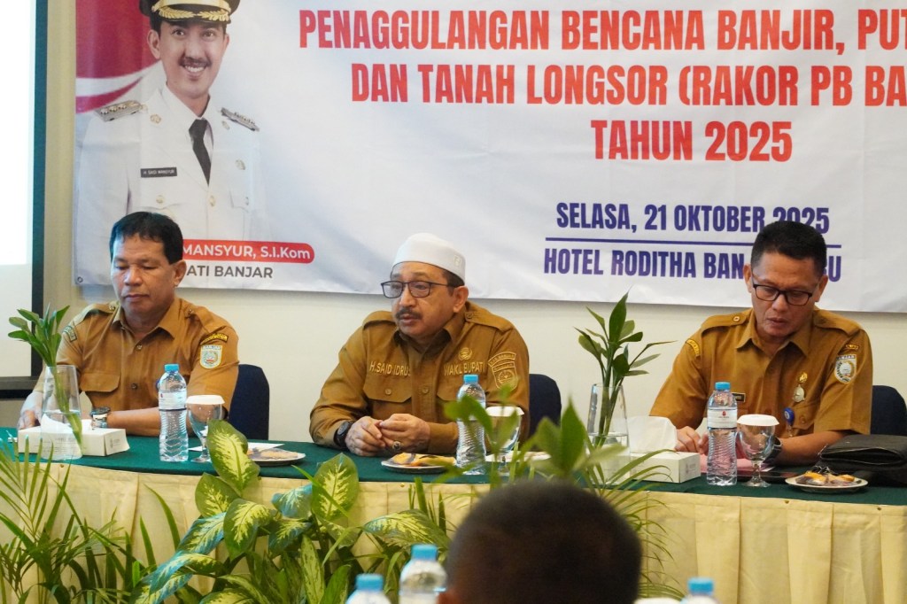 MARTAPURA – Badan Penanggulangan Bencana Daerah (BPBD) Kabupaten Banjar menggelar Rapat Koordinasi Penanggulangan Bencana Banjir, Puting Beliung, dan Tanah Longsor (PB Batingsor) Tahun Anggaran 2025, bertempat di Hotel Roditha Banjarbaru, Selasa (21/10/2025) pagi.