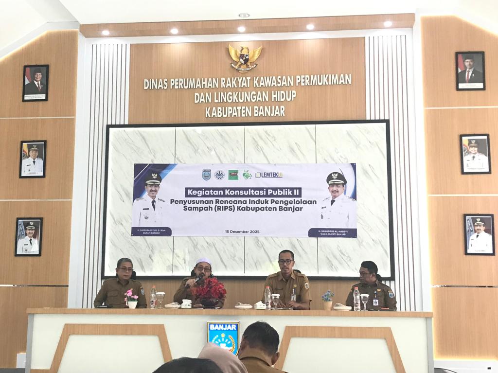 MARTAPURA – Pemerintah Kabupaten Banjar melalui Dinas Perumahan Rakyat, Kawasan Permukiman dan Lingkungan Hidup (DPRKPLH) menggelar Konsultasi Publik II Penyusunan Rencana Induk Pengelolaan Sampah (RIPS) di Aula Putih Dinas PRKPLH Kabupaten Banjar, Martapura, Senin (15/12/2025).